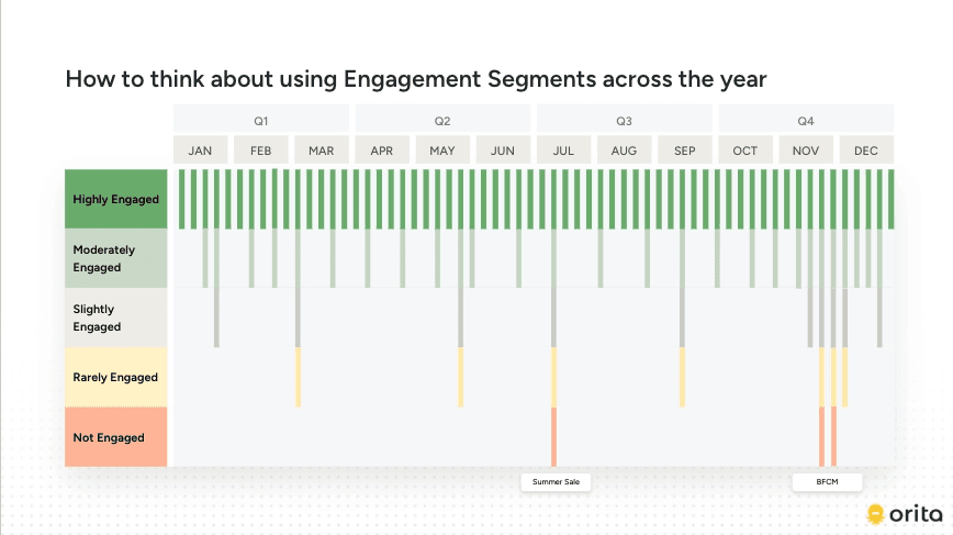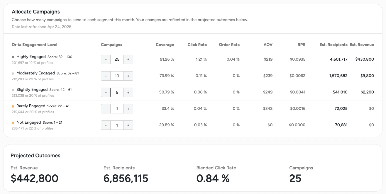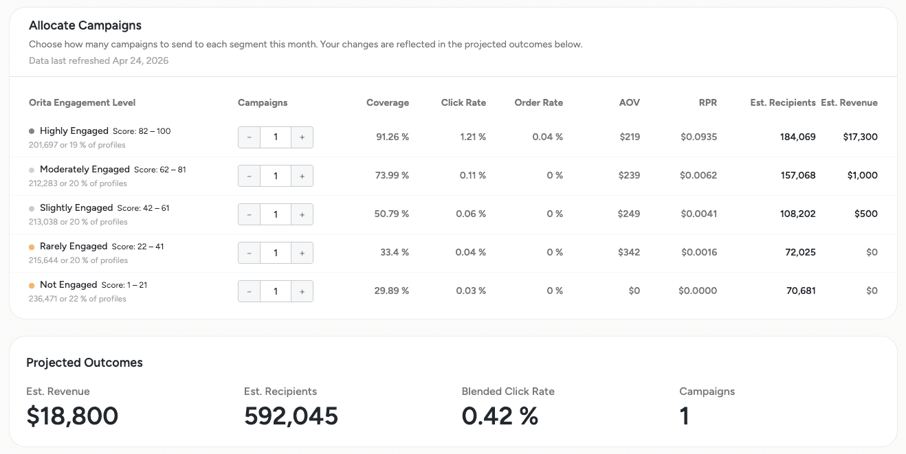 For example, a segment like "180D Engaged" will likely pull in profiles that Orita would classify as Slightly or Rarely Engaged. When those profiles are included in your actual send, your real results in Klaviyo may diverge from what the Scenario Planner projected if you had only planned to send to Highly and Moderately Engaged. This can dilute click rates and revenue lift relative to the projection.