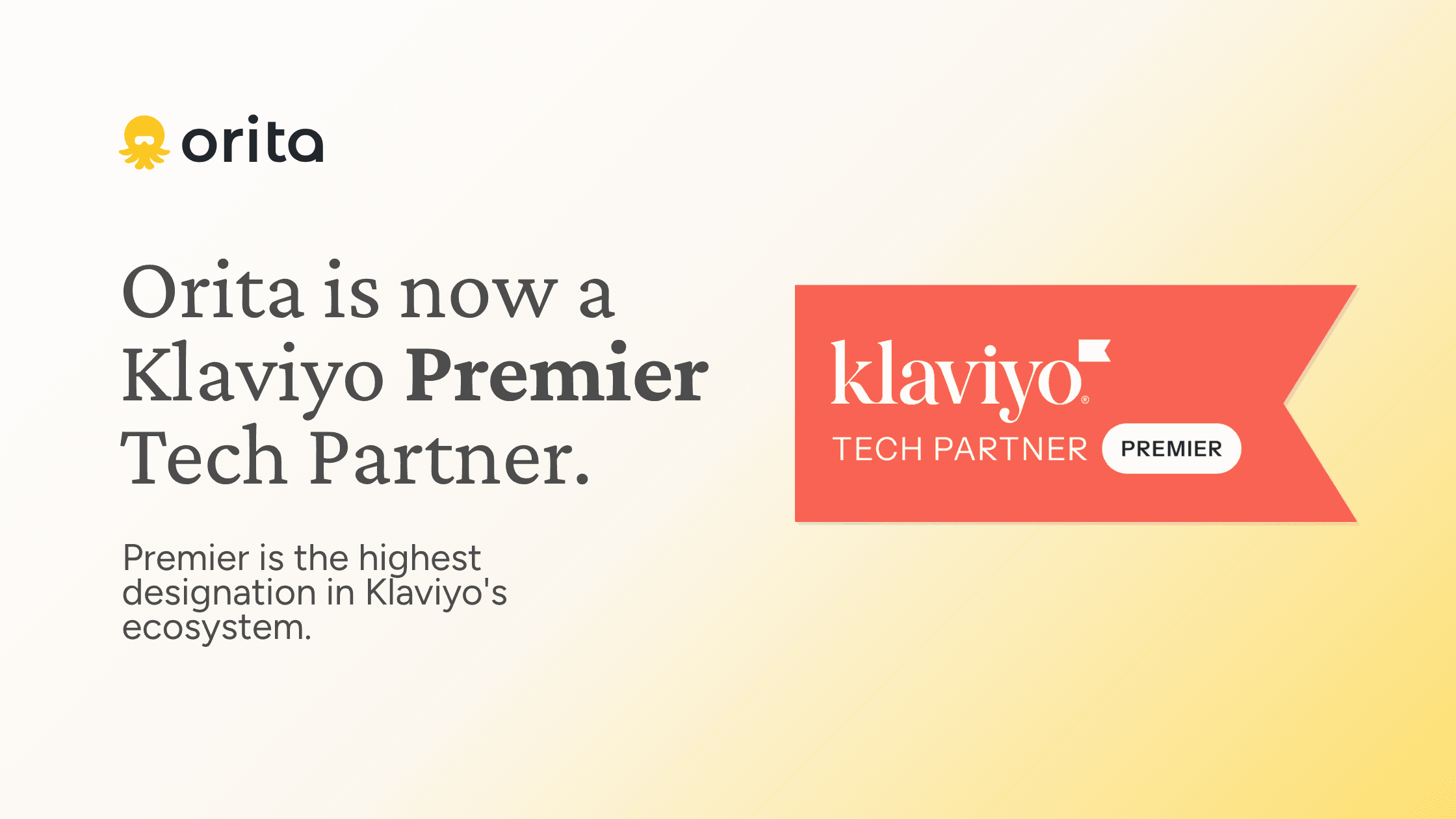 Orita has been elevated to Premier Partner in Klaviyo's Technology Partners Program. Premier is the highest designation in Klaviyo's ecosystem, and we're thrilled to breathe such rarified air.